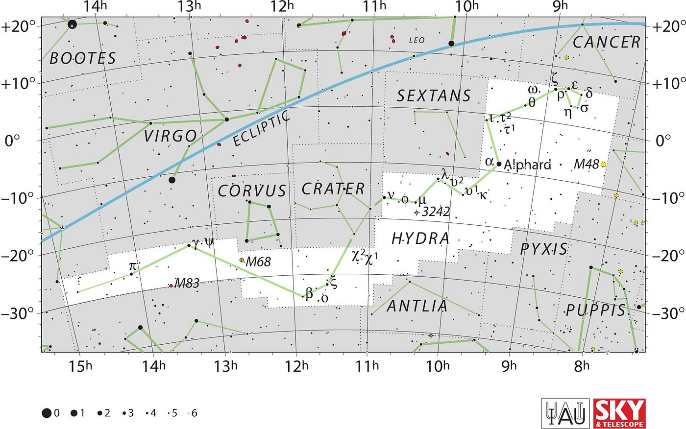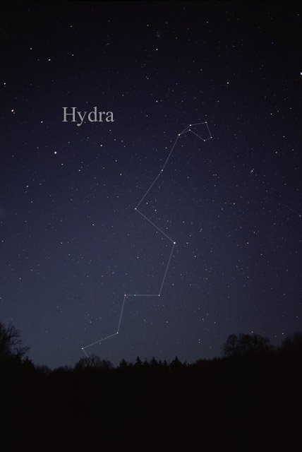 Na južnem nebu se razteza mogočna Hydra, Vodna kača, ki kot svetlobna reka valovi čez zvezdno morje. To je največje ozvezdje neba, razprostrto čez več kot tisoč kvadratnih stopinj – skoraj kot nebesni tok, ki povezuje vzhod in zahod neba. Njena osamljena vodnica, Alfard – »samotna« –, žari z mehkim oranžnim sijem, kot srce starodavne zveri, oddaljeno približno 180 svetlobnih let od nas.